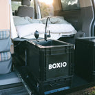 Das tragbare Campingspülbeckender Marke Boxio ist ideal für Nomadenreisen und Roadtrips im Van, Transporter oder Auto und bietet einfachen Zugang zu Trinkwasser.