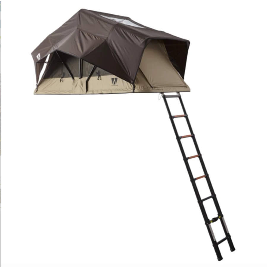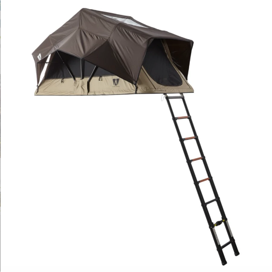 Ziehen Sie die Teleskopleiter heraus und kippen Sie das Dachzelt zum Entfalten. Selbstverständlich können Sie die Höhe der Leiter verstellen, um sicherzustellen, dass Ihr Dachzelt perfekt gerade steht.