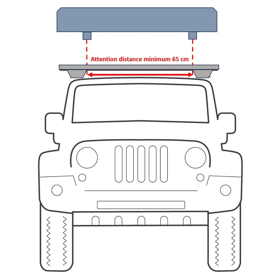Um die Kompatibilität mit Ihrem Fahrzeug zu gewährleisten, müssen Sie sicherstellen, dass der Abstand zwischen Ihren Dachträgern und den Montageschienen Ihres Zeltes mindestens 65 cm beträgt (siehe Diagramm). Es ist wichtig, den Abstand zwischen den beiden Befestigungspunkten Ihrer Dachträger zu messen.
