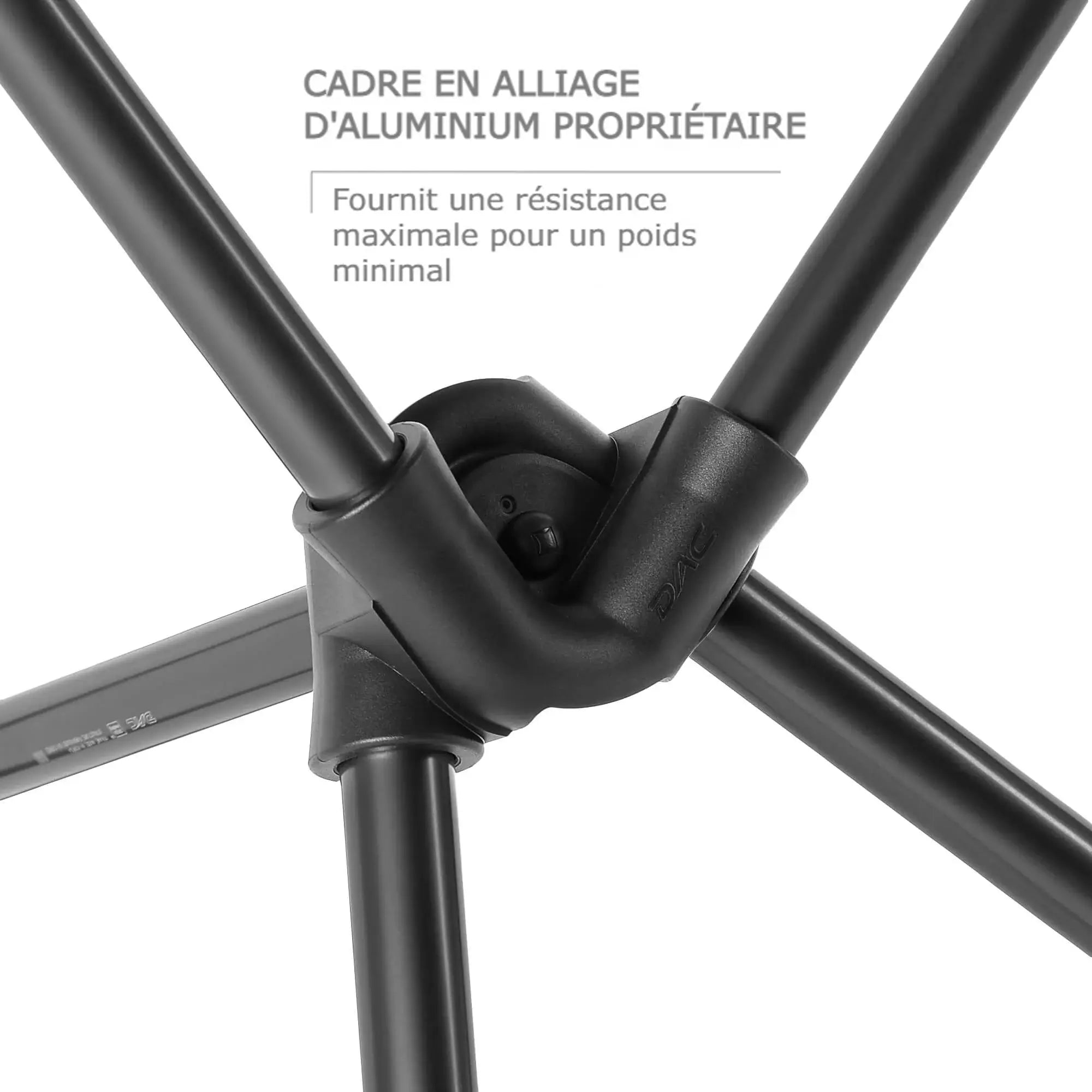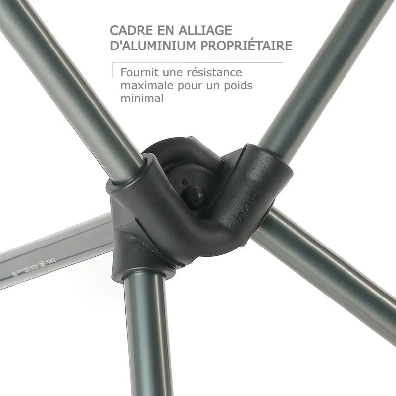 Its solid construction makes it extremely stable thanks to its frames made of Aluminum DAC TH72M (alloy used for the poles of very high quality tents). It can therefore support a weight of up to 145 kg. In addition, the high-quality mesh inserts ensure pleasant ventilation.