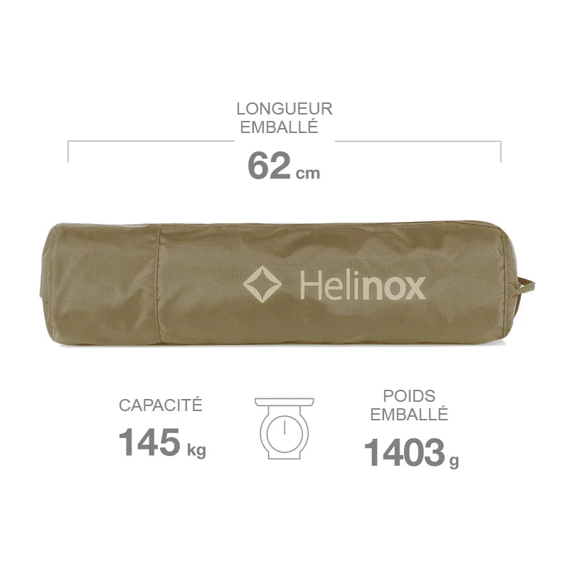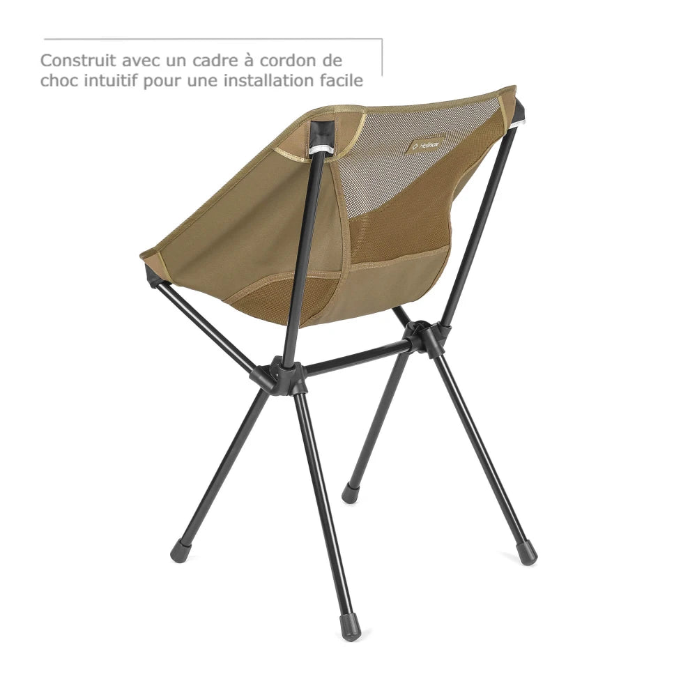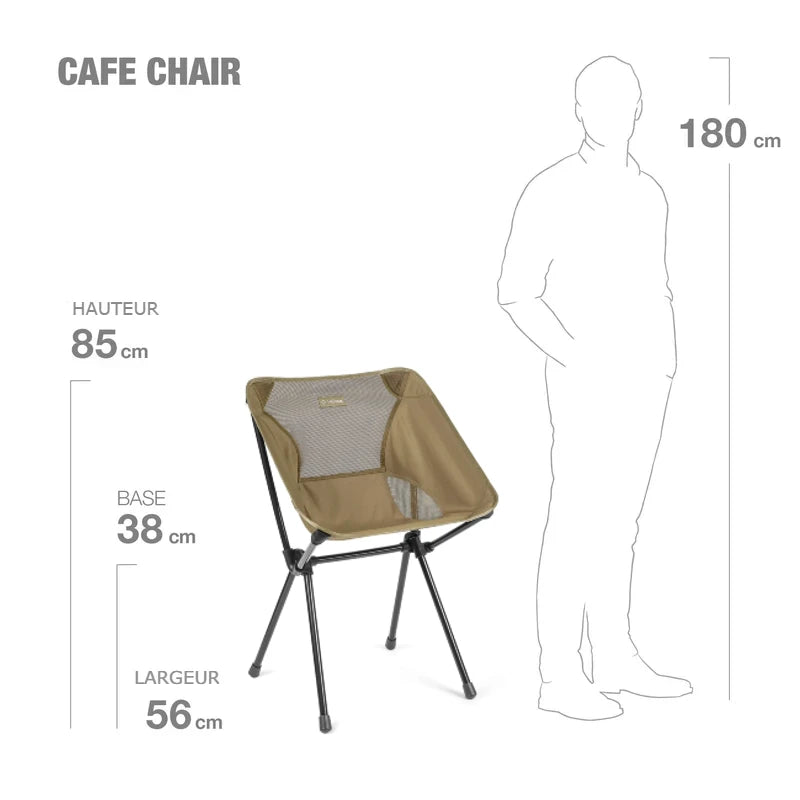 The Helinox Folding Cafe Chair is ideal for all travelers who want to sit comfortably at a convenient height and next to a standard-height table. It has the same height of a dining table chair (seat height at 38 cm in height).