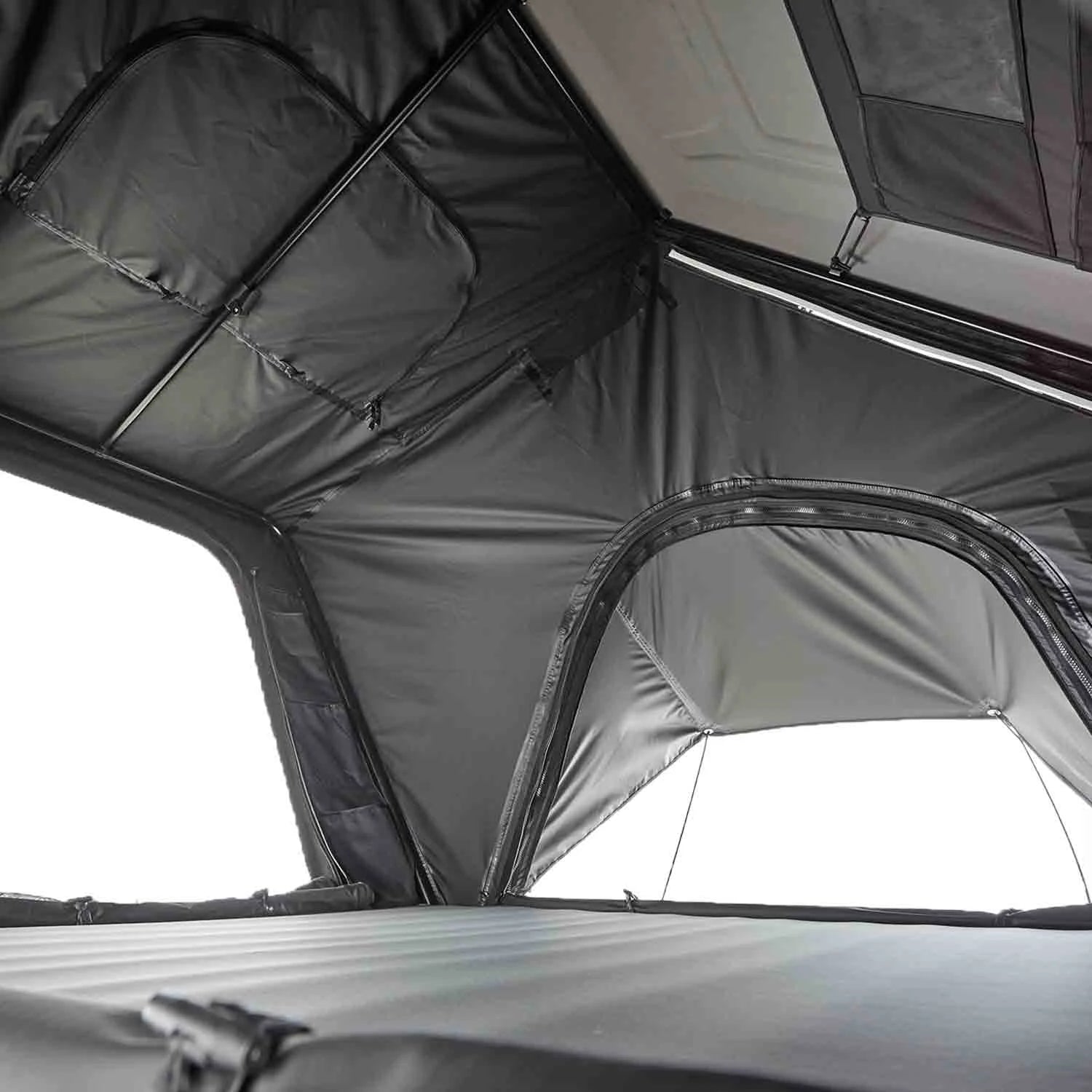 L'intérieur de solutions de rangement ingénieuses, incluant de nombreuses poches et un filet de plafond, ainsi qu'un éclairage LED intégré réglable pour vos soirées de lecture au sommet de votre véhicule.