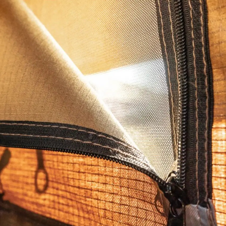 Le tissu intérieur en polycoton de 320g, résistant aux déchirures, régule efficacement l'humidité : le coton absorbe l'humidité à l'intérieur de la tente, tandis que le polyester la transfère vers l'extérieur.