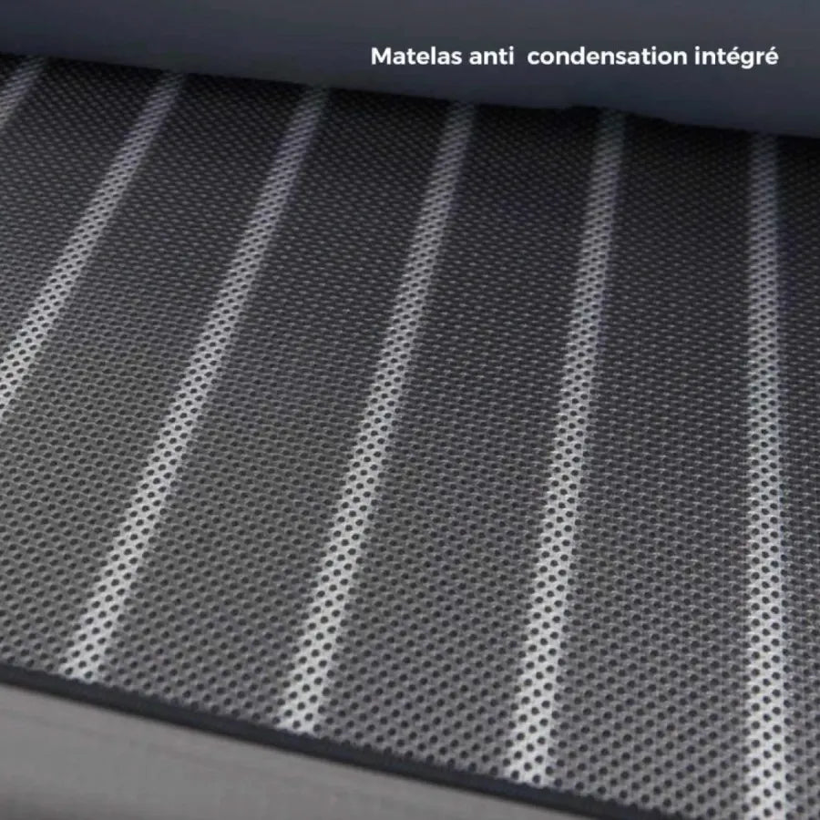 Le sous matelas anti-condensation en maillage 3D intégré ainsi que les grandes ouvertures sur les côtés offrent une circulation de l’air optimale et une très bonne aération de l’espace de couchage.