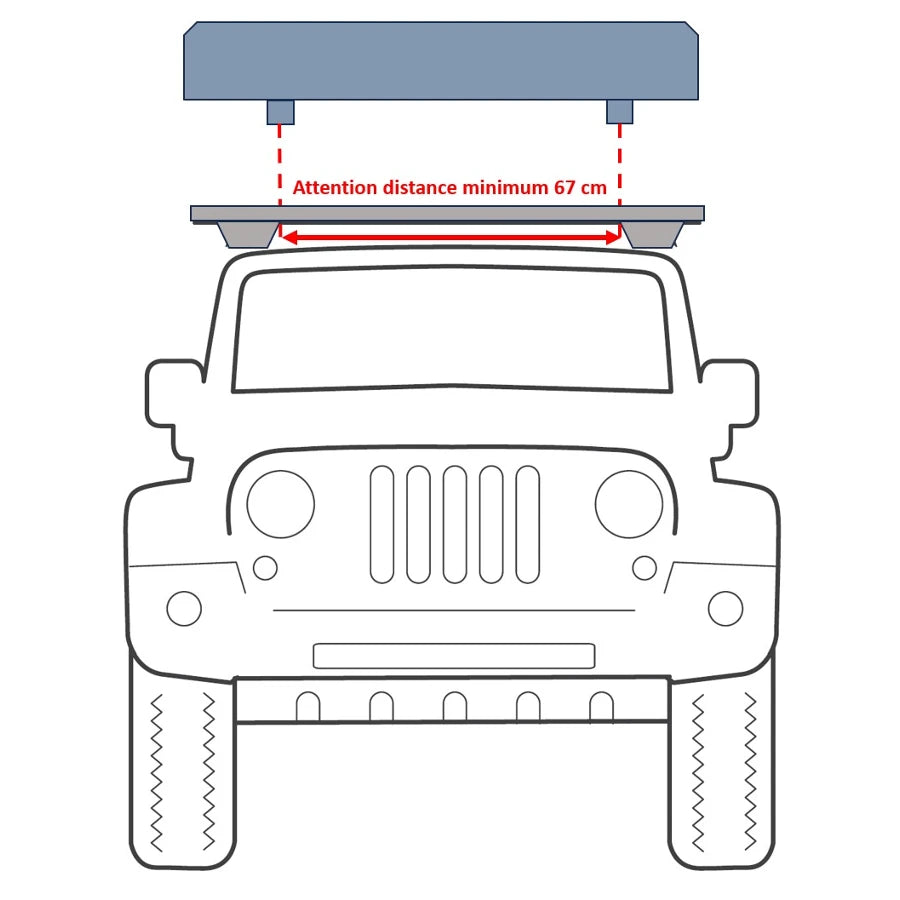 Afin d’assurer la compatibilité avec votre véhicule, vous devez vous assurer que la distance entre vos barres de toit et les rails de fixation de votre tente soit de 67cm minimum (voir schéma). Il est important de mesurer la distance entre les deux points d’attache de vos barres de toit.