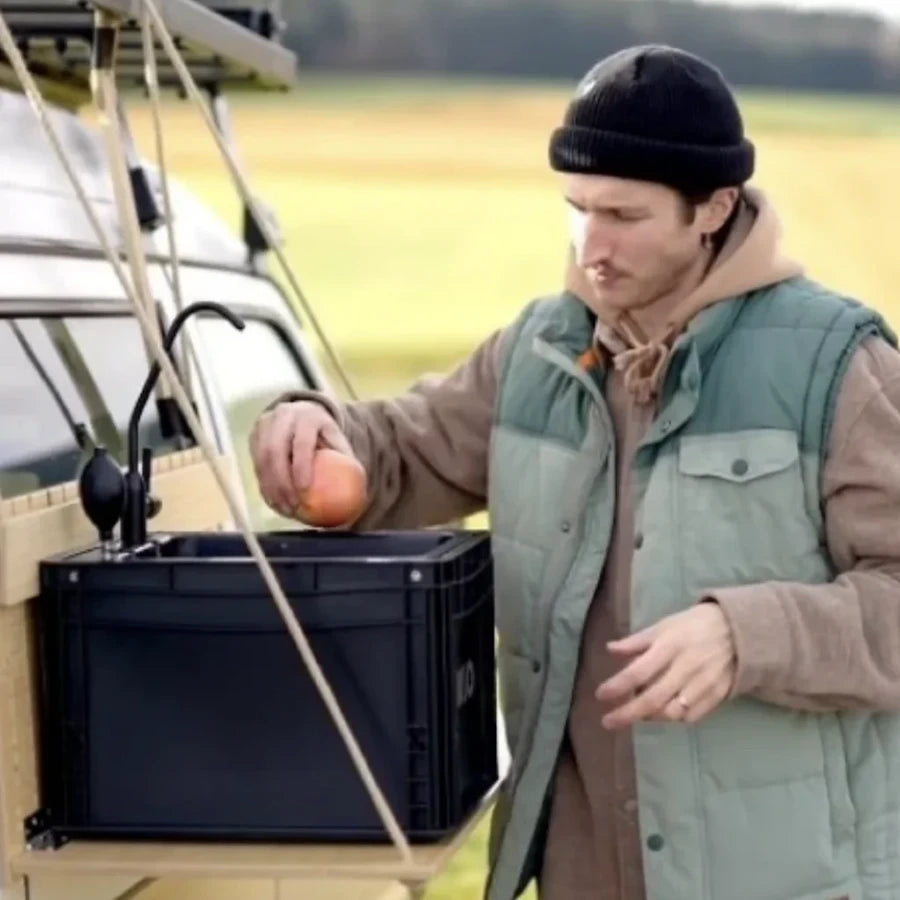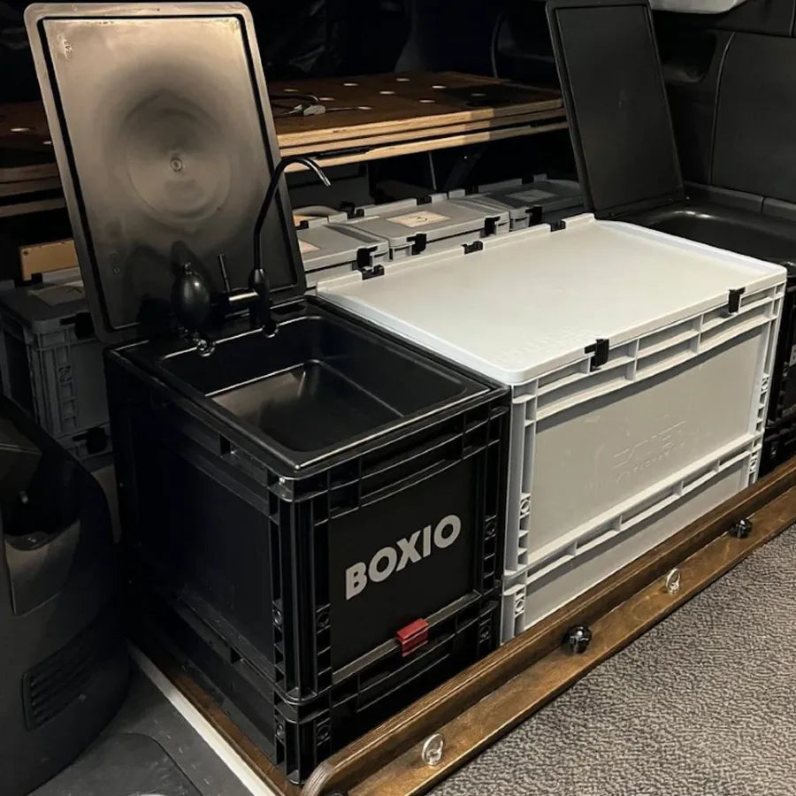 L’évier portatif Boxio Wash Plusde la marque allemande BOXIO est pensé pour les road trips en van ou fourgon aménagé, les voyages nomades en tente de toit et le camping.