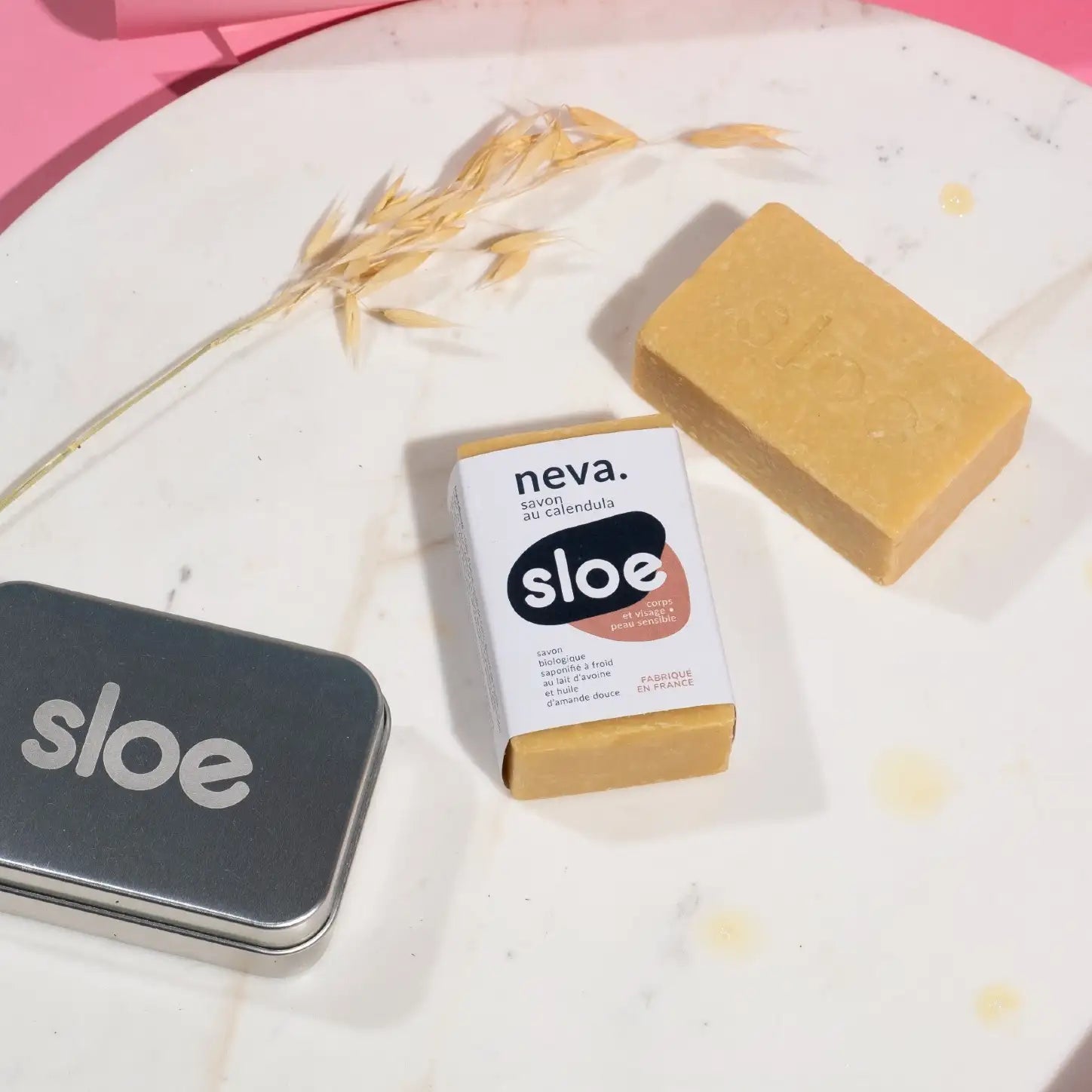Le savon naturel Neva de Sloe saponifié à froid, est enrichi au lait d'avoine et au Calendula. Aussi appelé fleur de souci, le calendula est cultivé en France dans les champs qui entourent l'atelier de fabrication de nos savons.