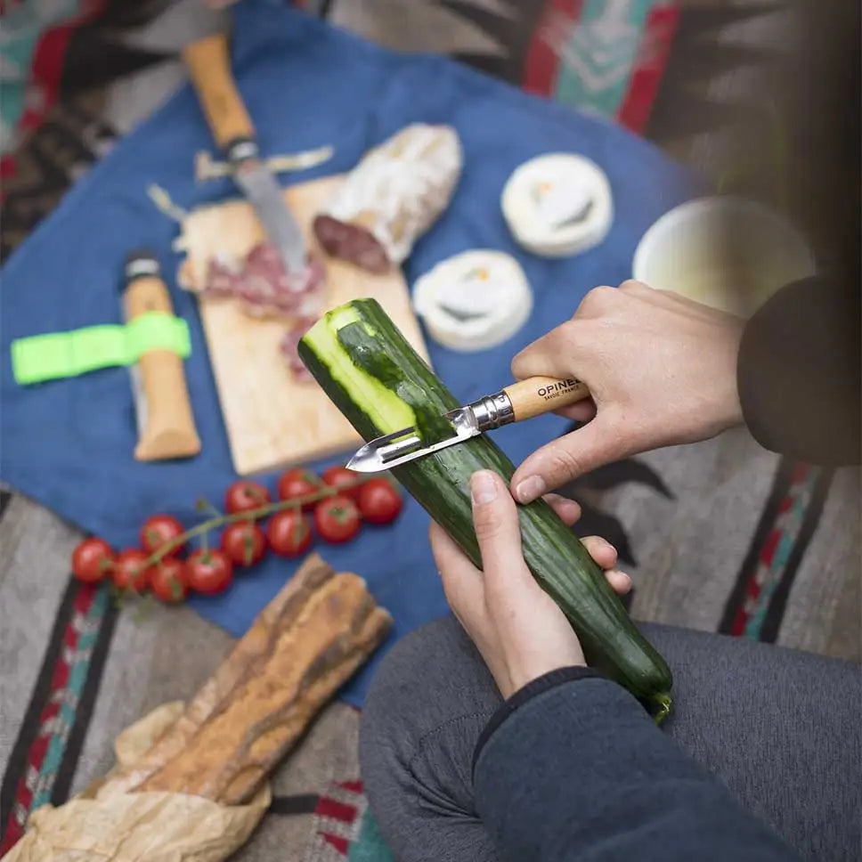 Il pelapatate tascabile N°06 della marca Opinel diventa rapidamente indispensabile per cucinare e sbucciare frutta e verdura quando sei in escursione, in road trip o in bivacco.