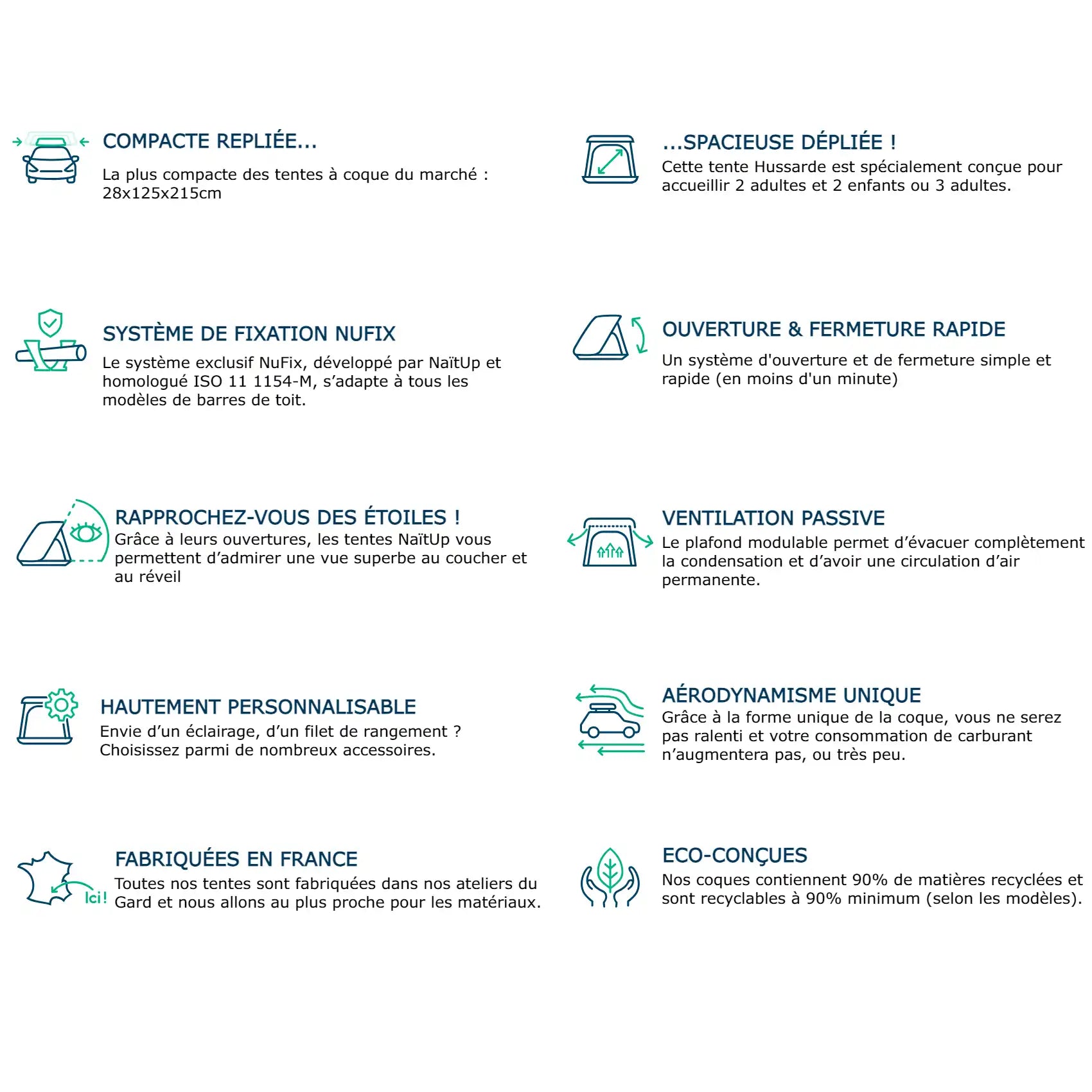 La tenda da tetto Hussarde Quatrö di Naït Up può essere personalizzata per adattarsi al meglio alle tue esigenze, al tuo veicolo (auto, van o furgone attrezzato) e al tuo modo di viaggiare.
