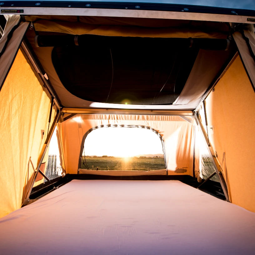 La tenda da tetto Hussarde Quatrö è progettata con una grande porta e una grande finestra, tutte dotate di zanzariera. Puoi così utilizzare la porta principale situata a destra oppure le porte secondarie e ammirare il paesaggio tutto intorno a te al tramonto e al risveglio.