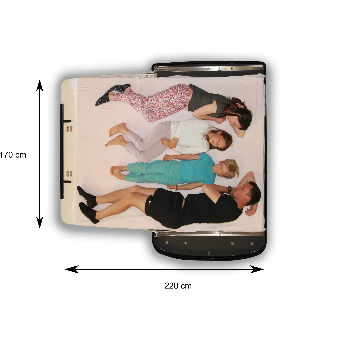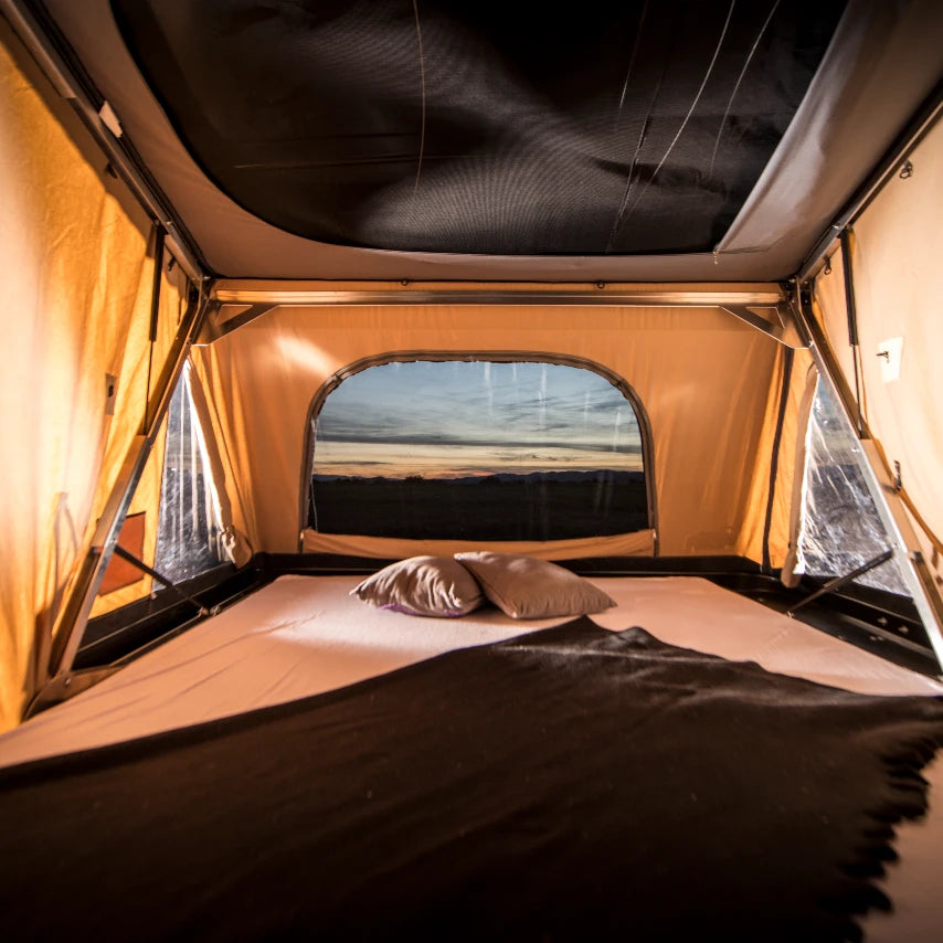 La tenda da tetto Hussarde Quatrö è molto compatta quando è chiusa e offre un volume molto spazioso quando è aperta, in particolare con la sua zona notte di 170cm * 210cm che può ospitare adulti e bambini. Con la sua altezza di 145cm, potrai sederti e inginocchiarti nella tenda.