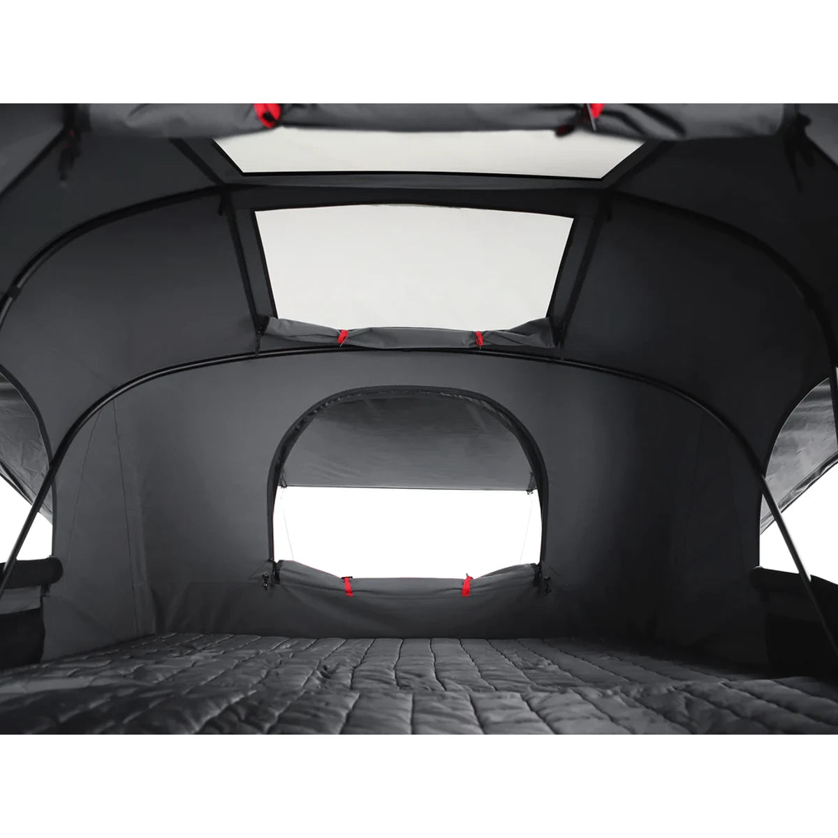Per offrirvi un massimo comfort, la tenda da tetto è dotata di due finestre laterali (una che funge da porta d'ingresso e ’una finestra frontale) così come duevelux Skyview per offrirvi più luminosità e per permettervi di addormentarvi sotto le stelle durante i vostri viaggi nomadi. Le finestre hanno un nuovissimo sistema di apertura che vi permette di aprirle separatamente o tutte insieme. Sul retro della tenda da tetto c'è una finestra facile da chiudere grazie alle cerniere lampo. Su ogni lato della tenda ci sono aste di tensione per montare più rapidamente le finestre. Queste aste hanno un vano speciale situato all'ingresso della tenda in una tasca portaoggetti.
