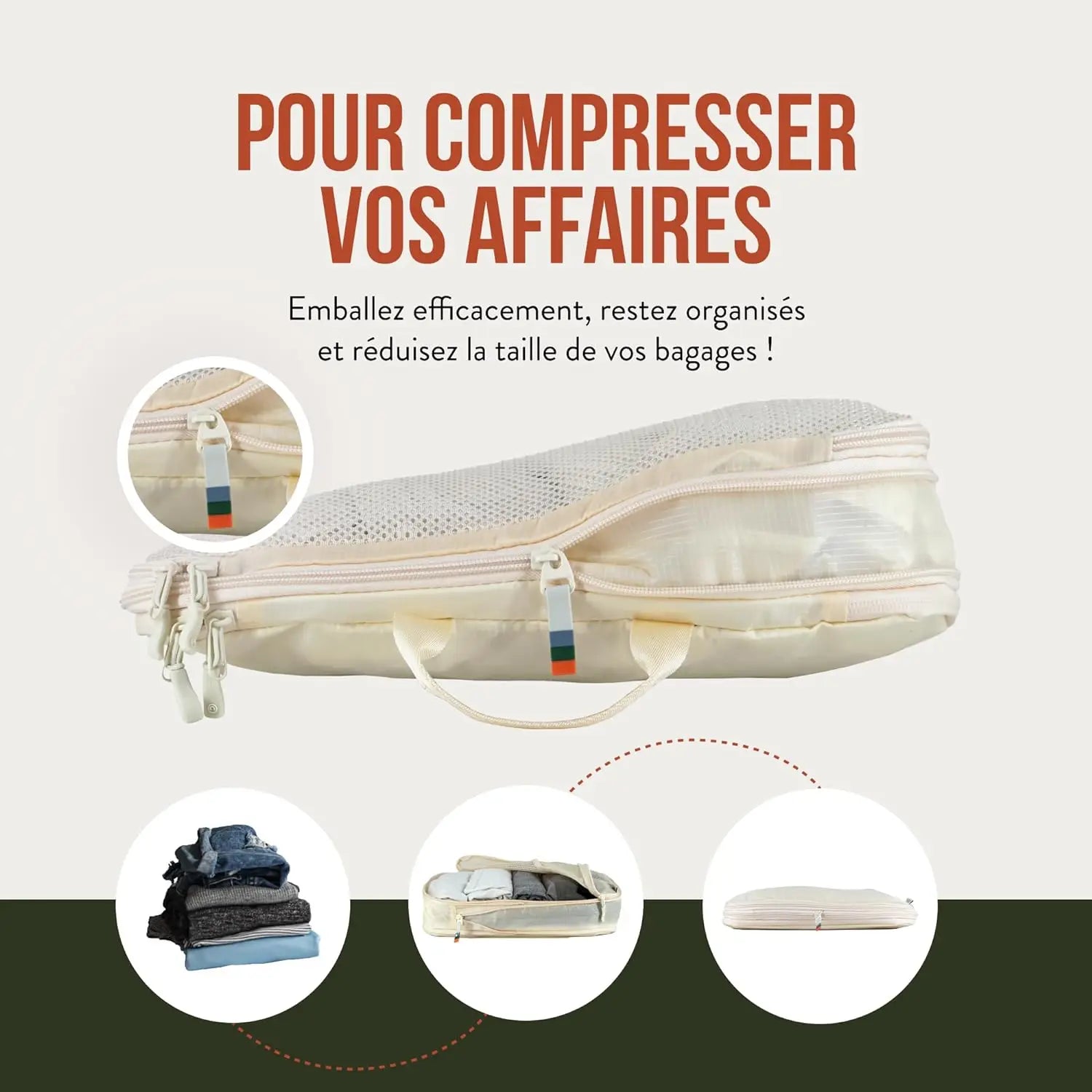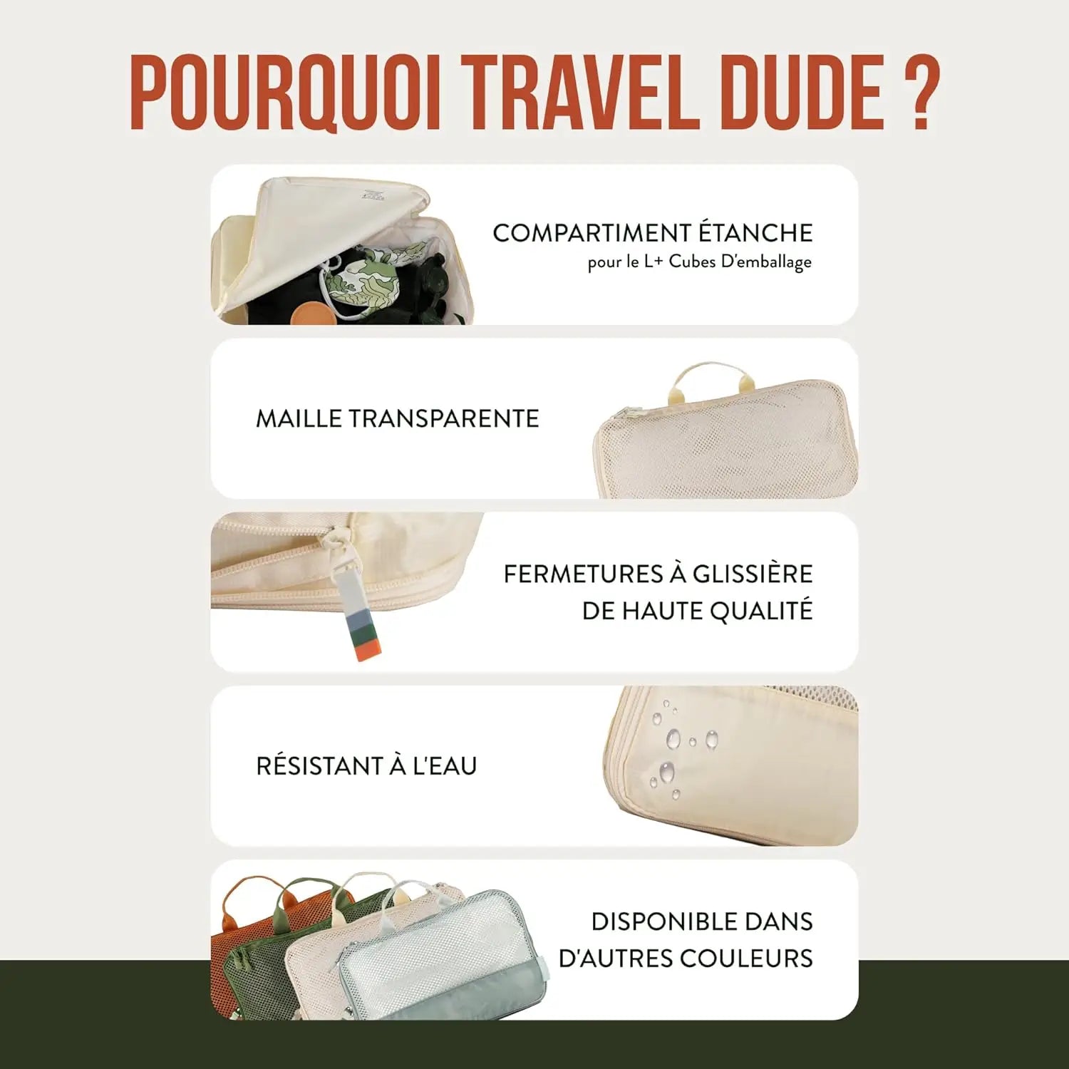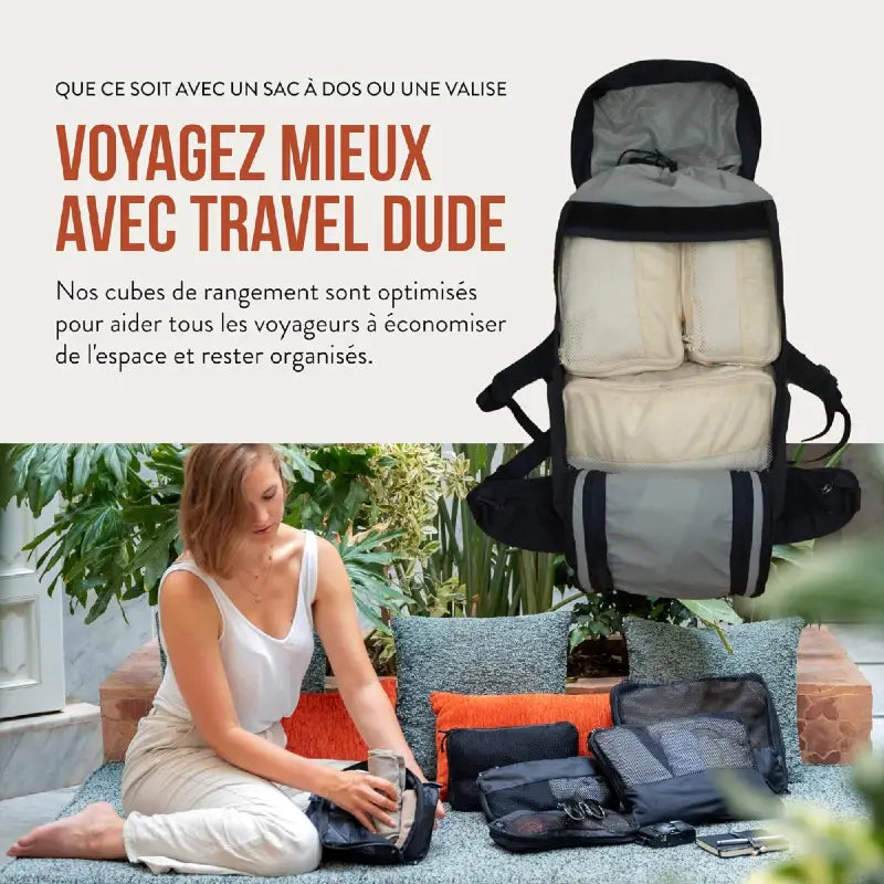 De opberg- en compressieset van het merk Travel Dude stelt u in staat om uwkleding gemakkelijk en snel te sorteren en organiseren tijdens uw nomadische reizen.
