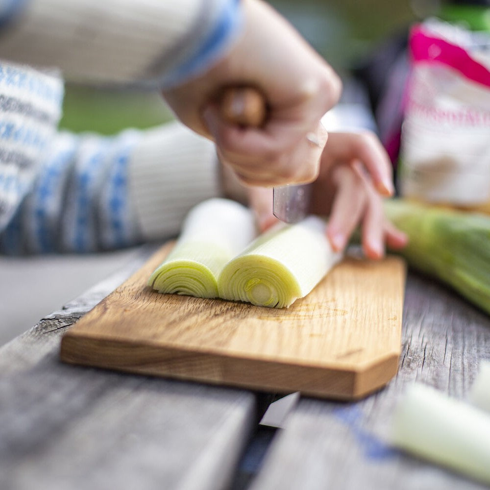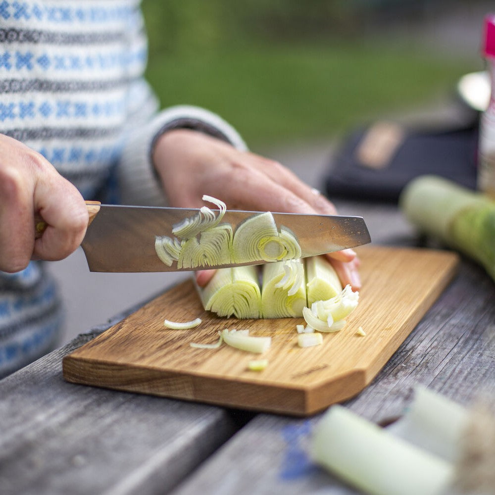 Het zeer veelzijdige en betrouwbare chefmes snijdt nauwkeurig en de duurzame eikenhouten snijplank van hoge kwaliteit biedt een glad en stevig oppervlak.