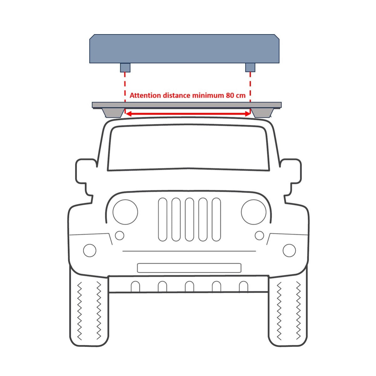 Om de compatibiliteit tussen uw dakdragers en de bevestigingsrails van uw tent te garanderen, is het belangrijk om de afstand tussen de twee bevestigingspunten van uw dakdragers te meten. 80cm (zie schema).