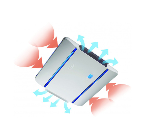 De interne diffuser is stijlvol en compact, met een dikte van slechts 4,2 cm, wat de installatie vergemakkelijkt dankzij de compacte afmetingen. Het zorgt voor een gelijkmatige en aangename luchtverdeling in de hele leefruimte. Het is uitgerust met een lichtblauw multifunctioneel scherm en LED-indicatoren die met de afstandsbediening bediend kunnen worden.