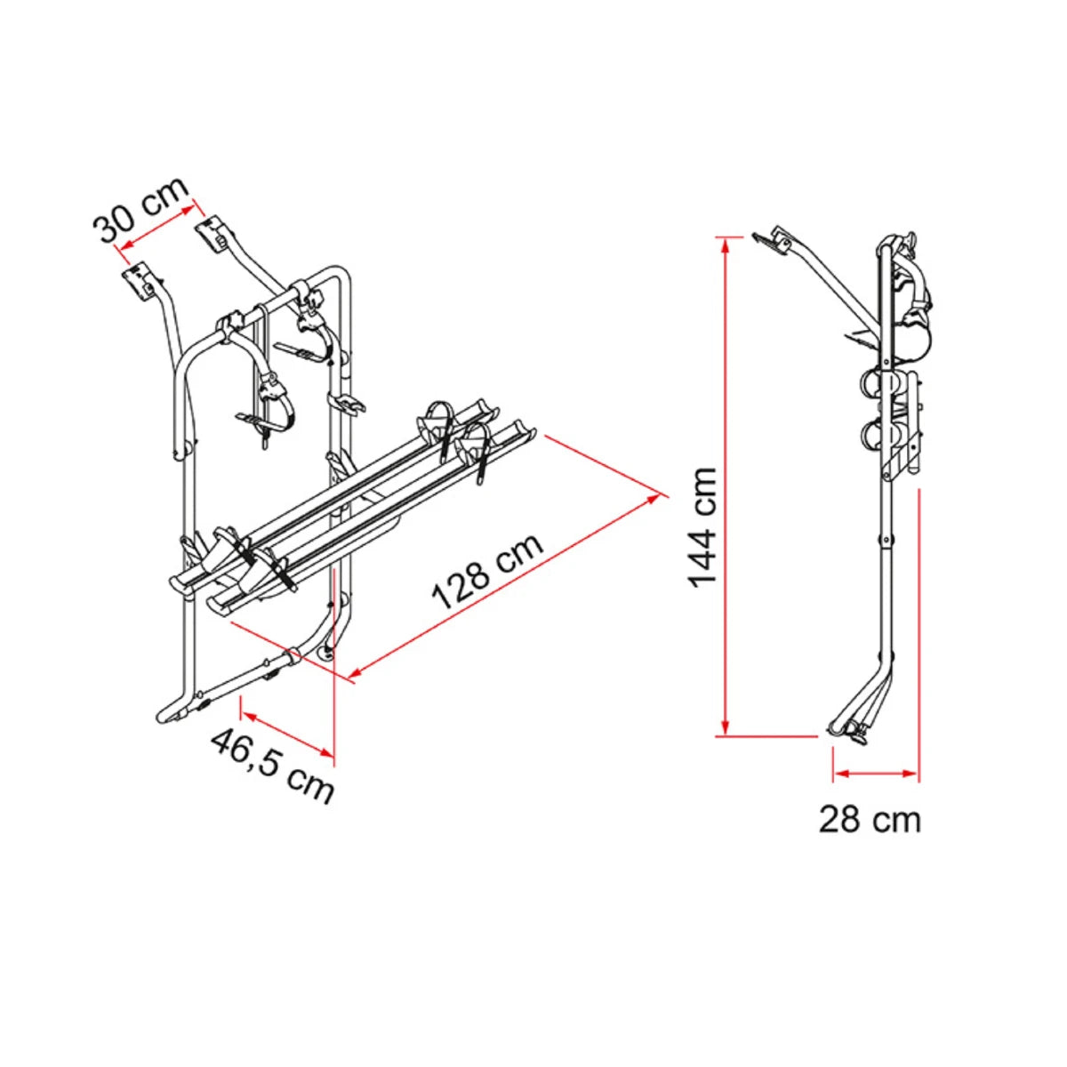 O suporte para bicicletas Carry Bike VW T5D / T6D da famosa marca italiana Fiamma é especialmente concebido para as vans Volkswagen T5 e T6 com porta traseira dupla.